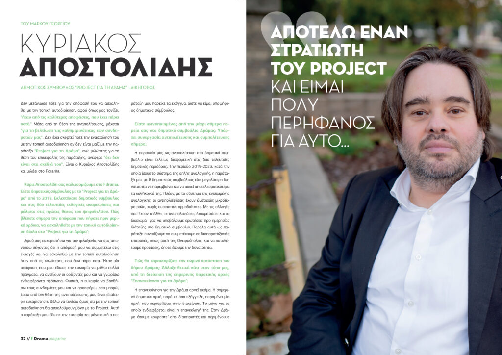 Δεν μετάνιωσε πότε για την απόφαση του να ασχοληθεί με την τοπική αυτοδιοίκηση, αφού όπως μας τονίζει, ’’ήταν από τις καλύτερες αποφάσεις, που έχει πάρει ποτέ.’’ Μέσα από τη θέση της αντιπολίτευσης, μάχεται ‘’για τη βελτίωση της καθημερινότητας των συνδημοτών μας’’. Δεν έχει σκεφτεί ποτέ την ενασχόληση του με την τοπική αυτοδιοίκηση αν δεν είναι μαζί με την παράταξη ΄΄Project για τη Δράμα΄΄, ενώ μιλώντας για τη θέση του επικεφαλής της παράταξης, ανέφερε ‘’ότι δεν είναι στα σχέδια του’’. Είναι ο Κυριάκος Αποστολίδης και μιλάει στο Fdrama.