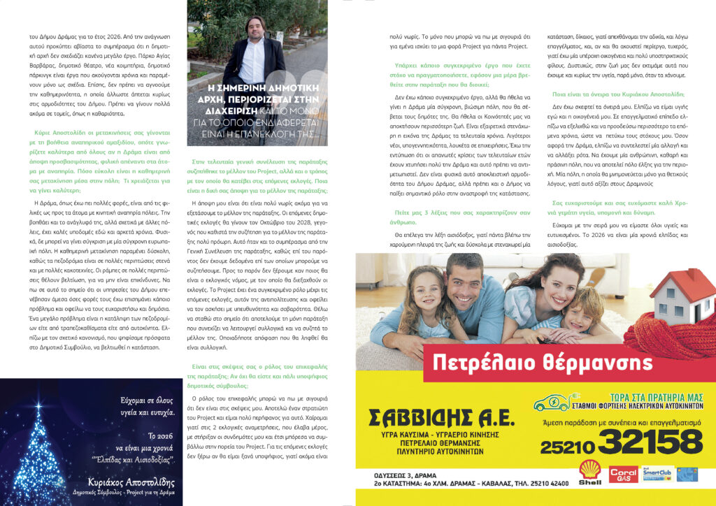 Πολλά λείπουν από την Δράμα. Και θα έλειπαν ακόμα περισσότερα, αν δεν είχαμε τους ευεργέτες. Η αλήθεια είναι ότι από αυτούς παράγεται κυρίως έργο στην Δράμα και, όπως φαίνεται, από αυτούς θα συνεχίσει και τα επόμενα χρόνια. Δεν υπάρχουν λόγια για να τους ευχαριστήσουμε, αλλά πρέπει και ως Δήμος να βγούμε μπροστά. Πριν από λίγες μέρες ψηφίστηκε το Τεχνικό Πρόγραμμα του Δήμου Δράμας για το έτος 2026. Από την ανάγνωση αυτού προκύπτει αβίαστα το συμπέρασμα ότι η δημοτική αρχή δεν σχεδιάζει κανένα μεγάλο έργο. Πάρκο Αγίας Βαρβάρας, δημοτικό θέατρο, νέα κοιμητήρια, δημοτικό πάρκινγκ είναι έργα που ακούγονται χρόνια και παραμένουν μόνο ως σχέδια. Επίσης, δεν πρέπει να αγνοούμε την καθημερινότητα, η οποία άλλωστε άπτεται κυρίως στις αρμοδιότητες του Δήμου. Πρέπει να γίνουν πολλά ακόμα σε τομείς, όπως η καθαριότητα.