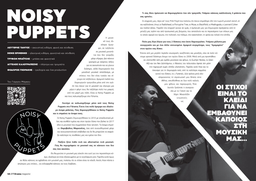 Η μουσική τους ιδιαίτερα όμορφη, σε ταξιδεύει σε μουσικά μονοπάτια που δεν γνώριζες μέχρι σήμερα. Δεν κάνουν φασαρία με σκόρπιες λέξεις για να ακουστούν και να γίνουν διάσημοι, αλλά δημιουργούν ένα μοναδικό μουσικό αποτέλεσμα, με στίχους που δεν είναι τυχαίοι και σίγουρα σε ταξιδεύουν. Δραμινά παιδιά που δημιουργούν τραγούδια μέσα από την αγάπη που έχουν για τη μουσική και σίγουρα μια μέρα η φήμη τους θα ταξιδέψει πολύ πιο μακριά, από την μικρή μας πόλη. Είναι οι Noisy Puppets και τους καλωσορίζουμε στο Fdrama.