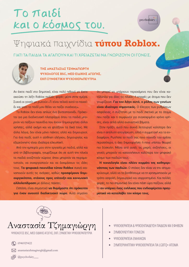 Από την εμπειρία μου στην εργασία με παιδιά, αλλά και από τη βιβλιογραφία, γνωρίζουμε ότι σε αυτή την ηλικία τα παιδιά αναζητούν χώρους όπου μπορούν να πειραματιστούν, να συνεργαστούν και να δοκιμάσουν τις ιδέες τους. Τα ψηφιακά παιχνίδια τύπου Roblox συχνά ικανοποιούν αυτές τις ανάγκες, καθώς προσφέρουν δημιουργικότητα, στόχους προς επίτευξη και κοινωνική αλληλεπίδραση με άλλους παίκτες.